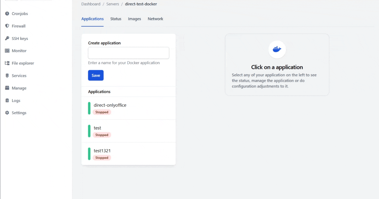 The Docker server type is completely broken, after creating application i can't seem to view it and it gives me 404 not found error but the application folder is created on the server. please see the below screenshot: