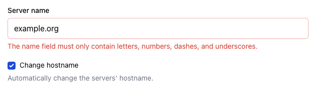 When trying to change a server name in /panel/servers/{server}/settings, validation fails for a FQDN. It is implied that this should be possible because of the 'Change hostname' checkbox.